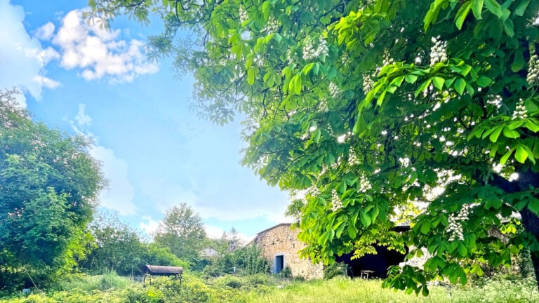 -Private green courtyard with covered terrace (25m2) and stone stable (28m2 on 2 levels)