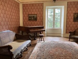 Rondom het kasteel staan prachtige bomen, sommige honderden jaren oud. Een smeedijzeren brug die over de droge slotgracht leidt, ondersteunt wit en paars bloeiende blauwe regen – prachtig in de lente.