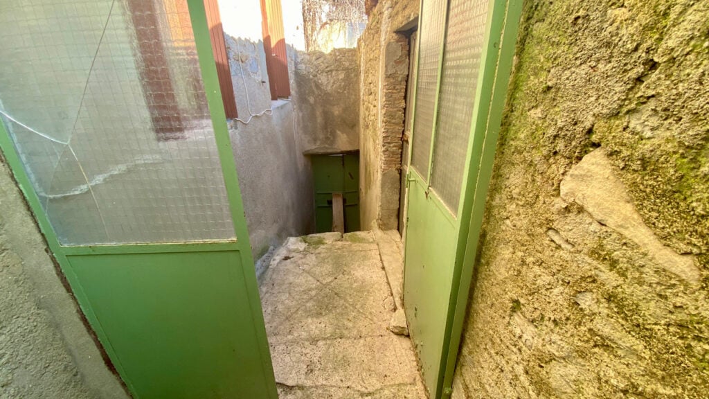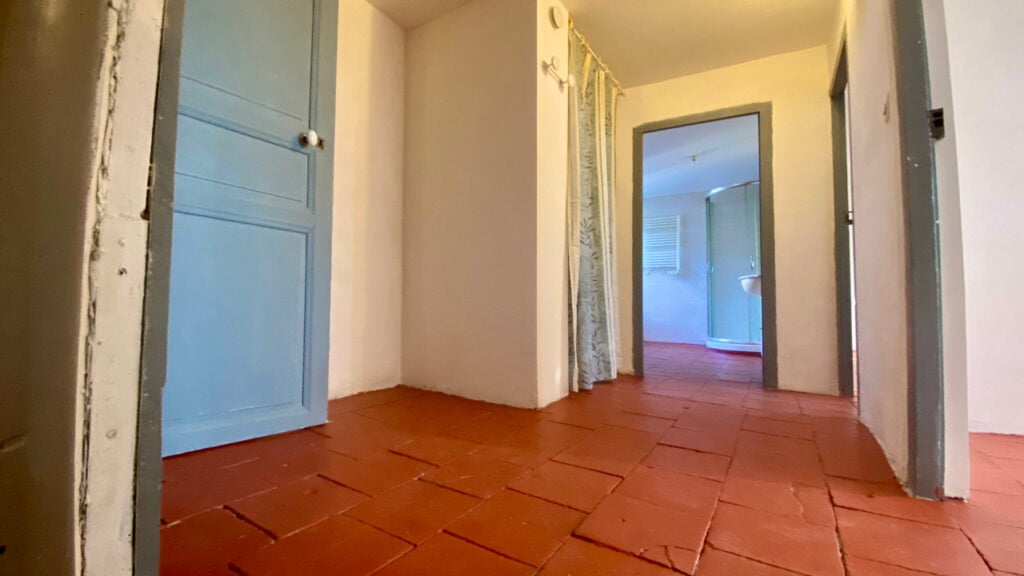 Vanuit een kleine geplaveide doorgang aan de buitenkant komt u via de voordeur in de hal met trap en gastentoilet en wastafel.