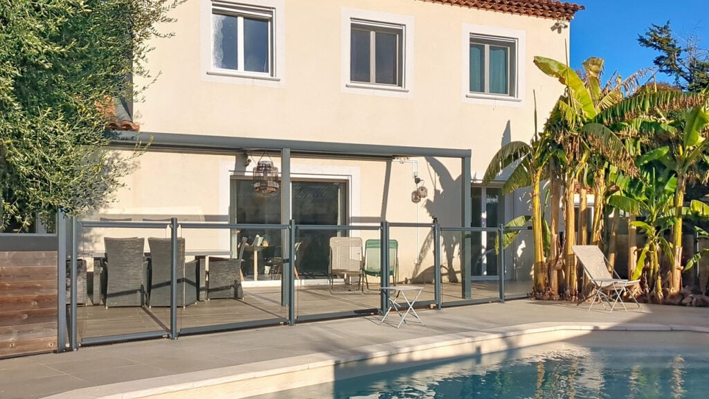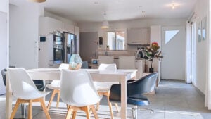 Vanaf het moment dat u binnenkomt, maakt de woonkamer met open keuken indruk met zijn overvloedige natuurlijke lichtinval en royale afmetingen. De woonkamer komt direct uit op een aangenaam terras en het zwembad, waardoor een binnen-buiten leefruimte ontstaat die perfect is voor gezinsmaaltijden, ontspannen momenten en gezellige avonden met vrienden.