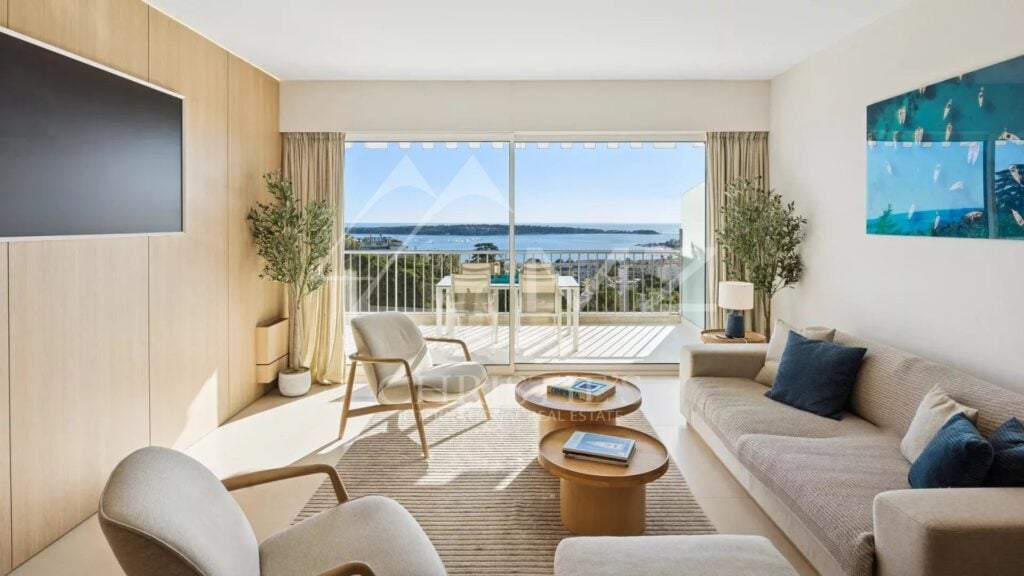 Het appartement beschikt over een lichte woonkamer, die uitkomt op een terras met een adembenemend panoramisch uitzicht op de Middellandse Zee en de Lé:rins-eilanden. De leefruimte, met een eigentijds en modern design, is perfect voor entertainment of om te genieten van momenten van ontspanning.