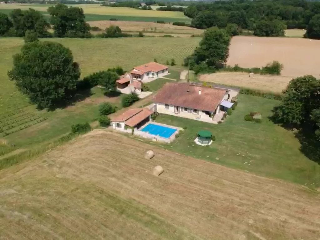 Het hoofdgebouw is met veel liefde door de huidige eigenaar gebouwd volgens hoge specificaties en biedt 3 slaapkamers, allemaal met eigen badkamer, een extra doucheruimte/toilet, een fantastische en grote open keuken, eethoek en woonkamer die uitkomt op een terras en zwembad, beide met uitzicht op het omliggende platteland van de Charente. Dit huis biedt ook nog een extra kamer, die momenteel wordt gebruikt als kantoor en bijkeuken.