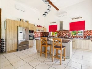 Het tweede vrijstaande huis biedt een open woonkamer met een keuken/eetkamer en woonkamer, 2 slaapkamers, beide met eigen badkamer, en een overdekt buitenterras en tuin.