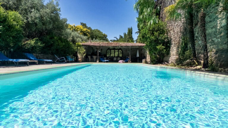 Exterieur = Schitterende tuin en binnenplaats gedeeld door de 2 huizen + mogelijkheid om ze onafhankelijk te maken + tuin gedeeld door de 2 huizen + zwembad (8×4,5m) + prachtig uitzicht + mogelijkheid tot parkeren op het perceel met toegang tot de achterkant van het huis aan de tuinkant.