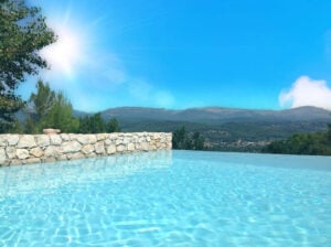 Extern geniet je van een prachtig overloopzwembad (10×5 m) omringd door verschillende zonnige of schaduwrijke terrassen, de ideale plek om te ontspannen of te entertainen.